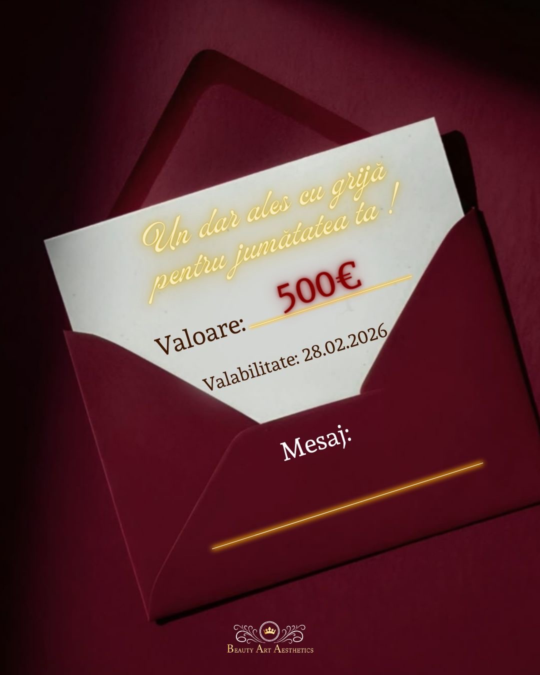 Un dar ales cu grijă pentru jumătatea ta, cu acest voucher de 500€! Cu această sumă generoasă, beneficiarul poate experimenta cele mai avansate tratamente pentru a revitaliza aspectul și a-și recăpăta vitalitatea. Valabil pana la data de 28.02.2026. (Citiți mai jos detaliile și condițiile aplicabile.)